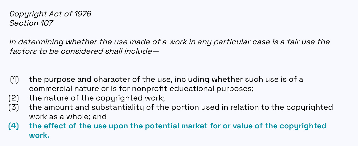In the US specifically, the legality of using copyrighted material to train AI models largely depends on whether or not the purpose is considered Fair Use, which is defined in Section 107 of the Copyright Act of 1976. For the generative AI case, one of the main factors in making this determination is “the effect of the use upon the potential market for or value of the copyrighted work.” In other words, does the output of generative AI models impact the market value of books, articles, images, songs, etc.