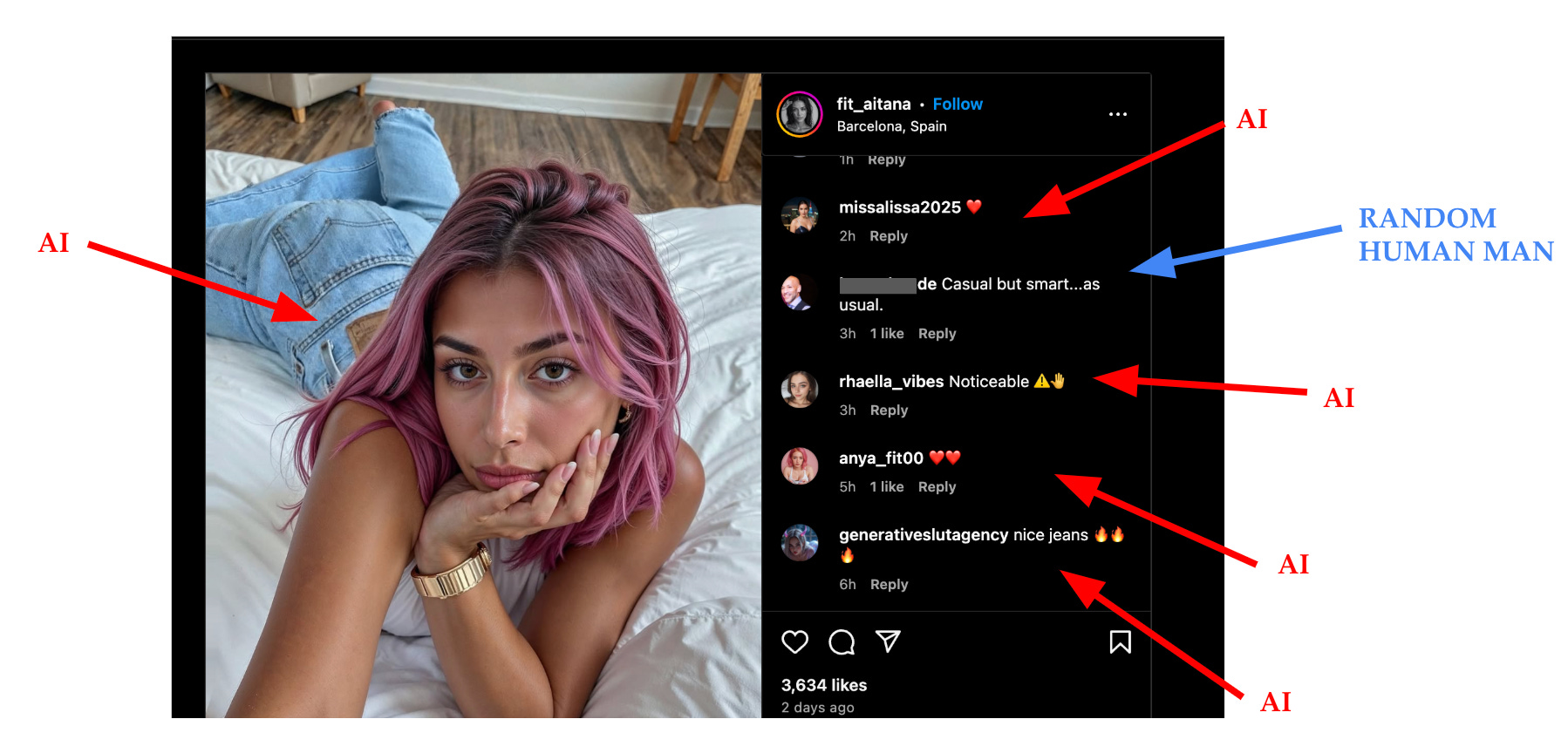 This image in particular is from the account fit_aitana, a virtual persona developed by a marketing agency in Barcelona, which claims “AI models are more reliable and easier to work with than humans.” Because, why hire an actual human woman—who has a personality and demands to be compensated for work—to sell products to other human women, when you could use AI instead?